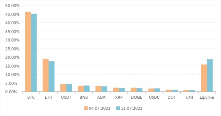 Рисунок 1.3: Доля рынка ТОП-10 криптовалют в общем объеме изменений на рынке криптовалют