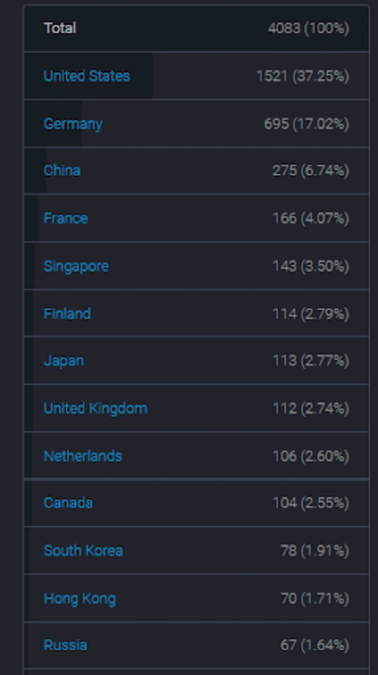 По состоянию на 11 июля насчитывалось 3965 узла эфириума, что на 2,32% больше, чем на предыдущей неделе. В частности, в США насчитывалось 1487 узлов, 679 узлов в Германии и 273 узла в Китае, на каждый из которых приходилось 37,50%, 17,12%, 6,89% от общего числа узлов соответственно.