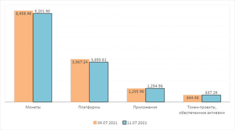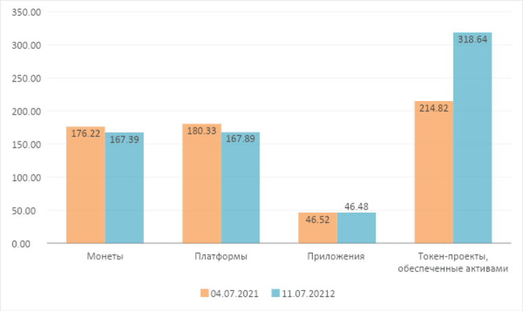 В сегменте 100 ведущих криптовалютных проектов наибольшее снижение общей рыночной капитализации у проектов платформ. Так же их средняя рыночная стоимость снизилась больше всего. По состоянию на 11 июля 2021 года общая рыночная стоимость проектов цифровых монет достигла $ 820,1 млрд, снизившись на 3,03%. Средняя рыночная стоимость проектов цифровых монет достигла $16,7 млрд, снизившись на 5,01%. Общая рыночная стоимость платформенных проектов достигла $369,3 млрд, снизившись на 6,90%. Средняя рыночная капитализация платформенных проектов достигла $ 16,7 млрд, увеличившись на 19,83%.