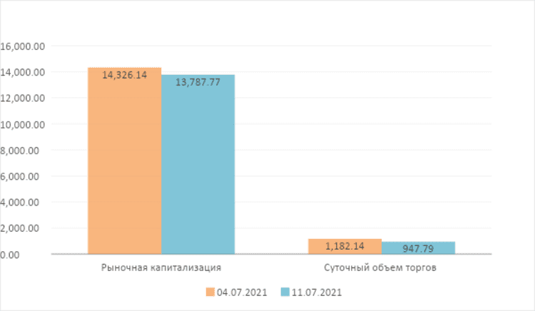 На неделе с 5 июля по 11 июля общая рыночная капитализация 100 ведущих криптовалют снизилась на 0,38%, при этом 67 проекта снизились в стоимости. По данным Coinmarketcap, по состоянию на 11 июля 2021 года общая рыночная капитализация криптовалют составила $1424,7 млрд, снизившись на 0,38%, а общая рыночная капитализация 100 ведущих криптовалют составила $ 1378,7 млрд, снизившись на 3,76% по сравнению с прошлой неделей.
