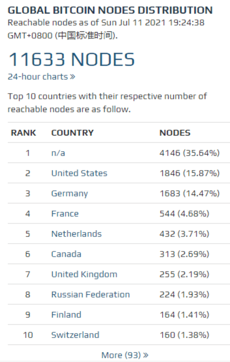 За неделю количество узлов в биткоине уменьшилось на 11,14%, а количество узлов в эфириуме увеличилось на 2,32%. По состоянию на 11 июля насчитывалось 11633 узлов биткоина, что на что на 11,14% меньше, чем на прошлой неделе, из них 1846 узлов в США, 1683 узлов в Германии, и 224 узлов находятся в России, на долю каждого из которых приходилось 15,87%, 14,47% и 1,93% от общего числа узлов биткоина соответственно. Россия уступила место в рейтинге Великобритании на прошлой неделе, и остается на 8 месте рейтинга.