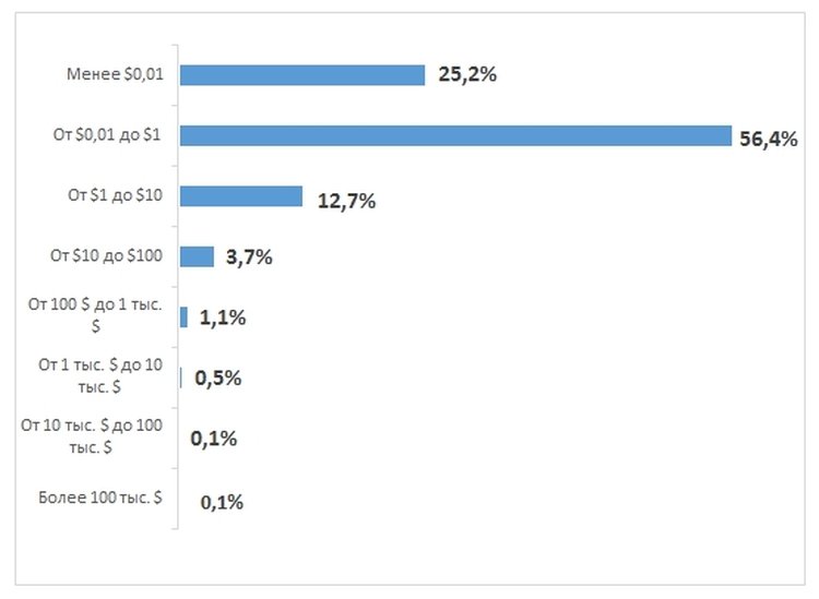 Остальные три группы – это дорогие монеты. Около 0,5% коинов и токенов стоят в пределах от 1 до 10 тыс. долларов, в эту группу входит также и биткоин. По 0,1% монет входят в группу, стоимость которой варьируется от 10 тыс. до 100 тыс. долларов, и в группу стоимостью более 100 тыс. долларов.