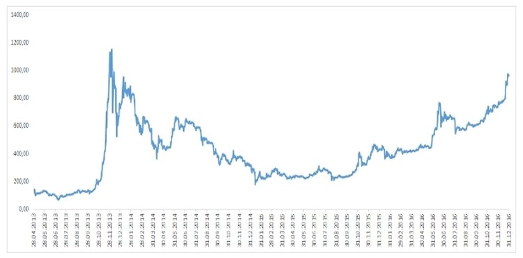 Рис. 1 Динамика стоимости биткоина в 2013-2016 гг.