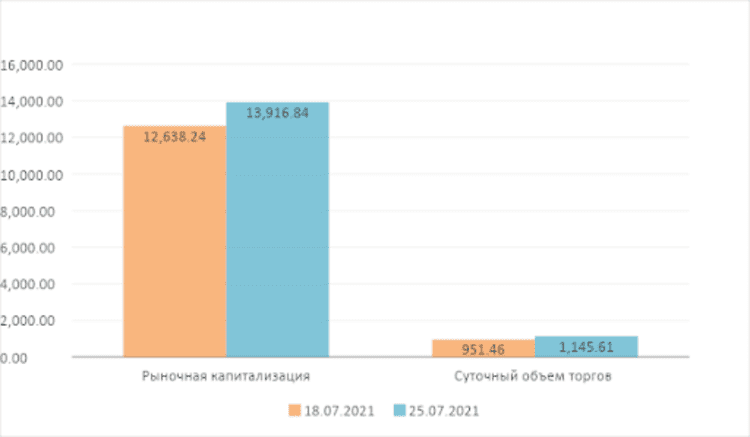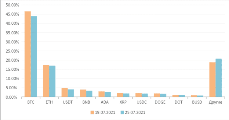 По состоянию на 25 июля биткоин торговался по цене $35350,19, что на 11,21% выше цены на прошлой неделе. Эфириум торговался по цене $2191,37, что на 15,70% ниже, чем на прошлой неделе.