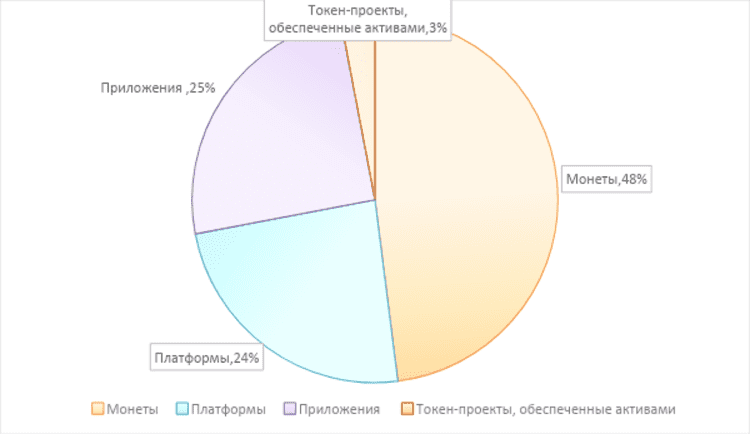 Распределение по сегментам рынка среди 100 ведущих криптовалют оставалось стабильным. По состоянию на 25 июля, среди 100 ведущих проектов количество проектов класса монет, проектов класса токенов обеспеченных активами, проектов класса приложений и платформ осталось прежним. Наибольшая общая рыночная капитализация по сегментам по-прежнему у проектов монет, на долю которых приходилось 59,80% от общей рыночной капитализации 100 крупнейших проектов.