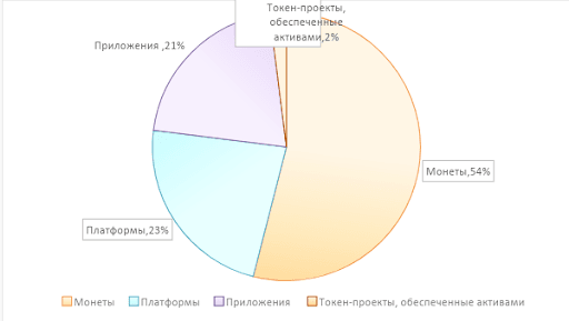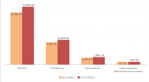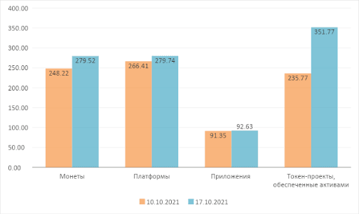 Распределение по сегментам рынка среди 100 ведущих криптовалют оставалось стабильным. По состоянию на 17 октября, среди 100 ведущих проектов количество проектов класса монет и проектов токенов, обеспеченных активами уменьшилось на 1. Проектов класса приложений и проектов класса платформ увеличилось на 1. Наибольшая общая рыночная капитализация по сегментам по-прежнему у проектов монет, на долю которых приходилось 62,43 % от общей рыночной капитализации 100 крупнейших проектов.