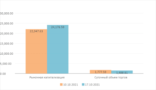 По данным Coinmarketcap, по состоянию на 17 октября общая рыночная капитализация криптовалют составила $2503,6 млрд, увеличившись на 9,13%, а общая рыночная капитализация 100 ведущих криптовалют составила $ 2417,6 увеличившись на 9,66% по сравнению с прошлой неделей. Среди криптовалют увеличивших капитализацию, наибольший рост на 416,29% у NU, в рейтинге рыночной капитализации проект поднялся с 276 до 98 места. Больше всего снизилась рыночная капитализация проекта DCR – -14%, в результате рыночная капитализация упала с 64 места до 71. Кроме того, в TOП-100 вошли 4 проекта: TEL (Telcoin, рост 16,24%, 90 место р.к.), KCS (KuCoin Token, рост 16,70%, 94 место р.к.), PERP (Perpetual Protocol, рост 32,37%, 85 место р.к.), NU (NuCypher, рост 416,29%, 98 место р.к.).
