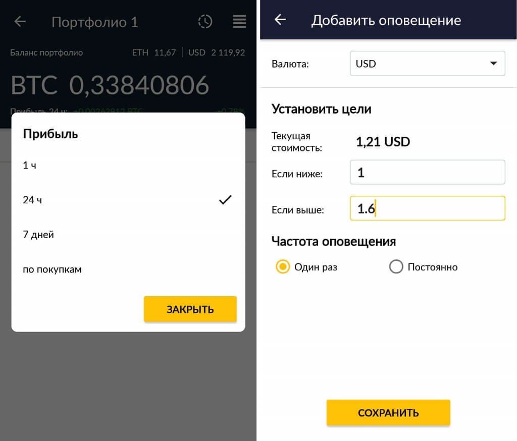 Чтобы не упустить этот момент, мы можем отслеживать доходность не только за 24 часа, но и за 1 час, а для долгосрочных инвестиций — за 7 дней. Для дополнительной страховки добавляем и настраиваем оповещения об изменении котировок, где устанавливаем максимальное и минимальное значения, при которых будем продавать валюту, чтобы получить сверхдоход и избежать крупных потерь соответственно.
