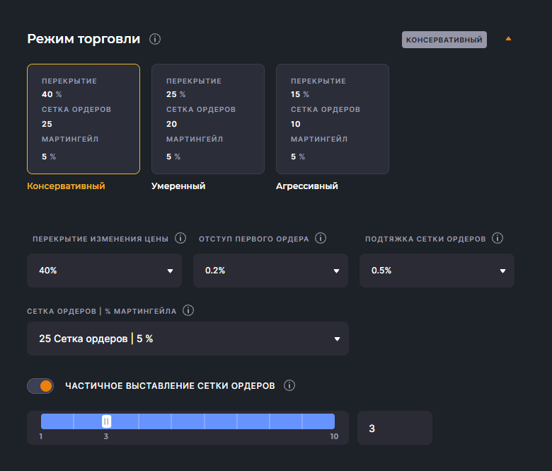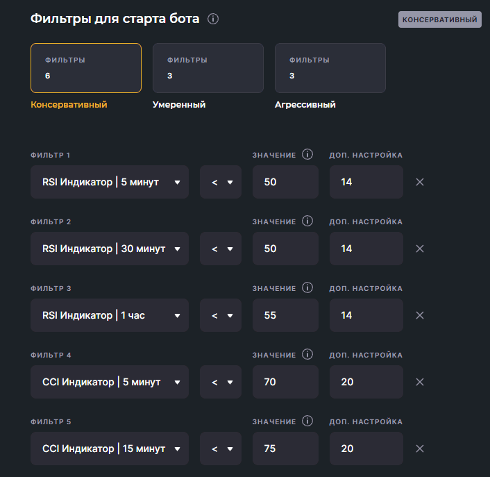 По сути, чем консервативней настройки – тем будет меньше сделок, но в то же время депозит у вас один. Так что тут каждый выбирает, какая стратегия ему подходит. Возможно стоит запустить несколько консервативных ботов и умеренных для соблюдения риск-менеджмента – но это опять же просто рекомендация.
