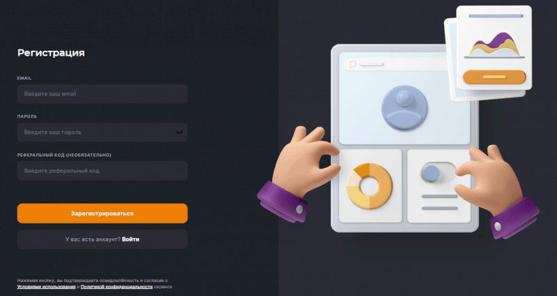 В процессе регистрации пользователю необходимо указать контактные данные и пароль от будущей учетной записи, код реферала (если он есть) — код человека или ресурса, который пригласил вас на платформу Veles. Если это поле заполнилось автоматически, менять его не нужно.