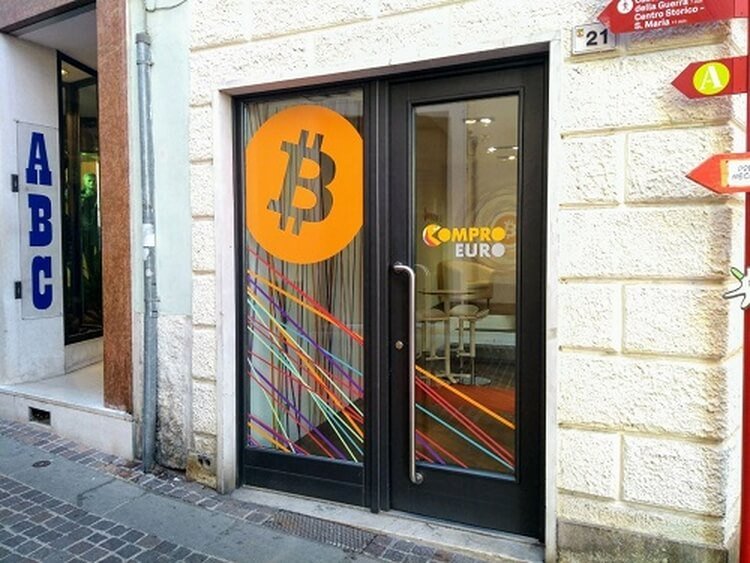 В городишке Роверето появились обменники “Куплю евро” (Compro Euro), в которых за реальные евро можно приобрести виртуальные биткоины. И потратить их здесь же, не отходя от кассы.