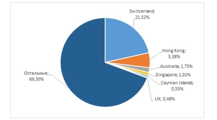 Согласно данным сервиса Сryptocompare.com, как минимум 21,52% всех собранных средств на ICO приходилось на проекты, зарегистрированные в Швейцарии, 5,38% – в Гонконге, 1,75% – в Австралии, 1,01% – в Сингапуре, 0,55% – на Каймановых островах, 0,48% – в Великобритании.