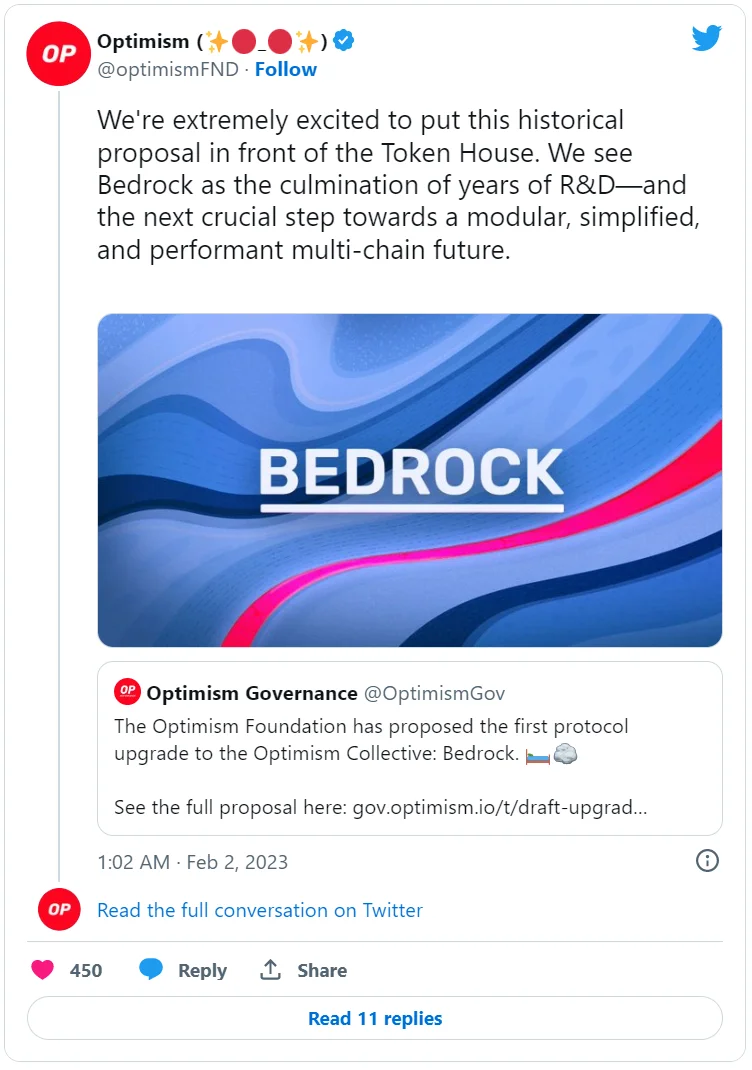 Подробности об обновлении. Bedrock призвано повысить производительность и функциональность протокола. С его помощью будет реализована модульная архитектура, а стек Optimism будет разделен на три компонента: консенсус, исполнение и расчеты. Особое внимание будет уделено повышению безопасности протокола.