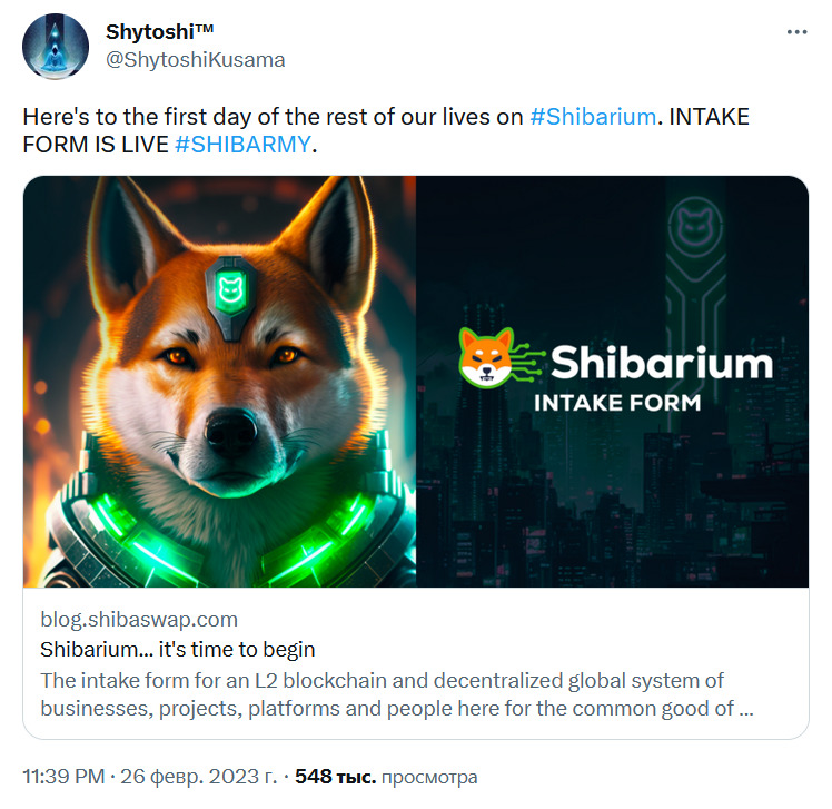 Как провозгласил в «Твиттере» Шитоши Кусама (Shytoshi Kusama), анонимный главный разработчик Shiba Inu, 26 февраля стал «первым днем нашей дальнейшей жизни на Shibarium»: