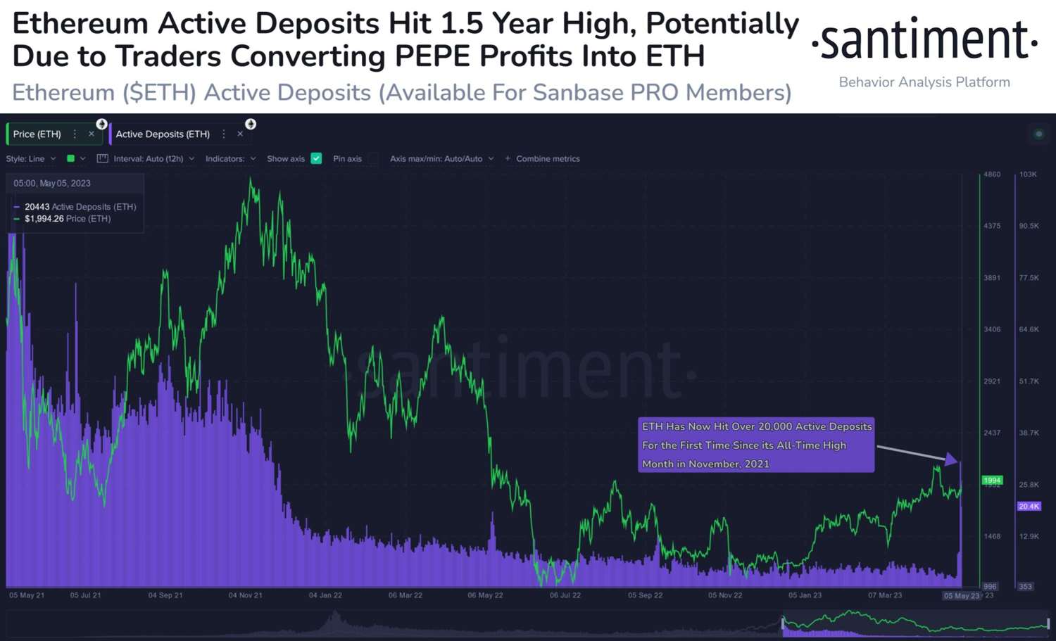 В аналитической компании Santiment сообщили, что трейдеры PEPE конвертируют свои монеты в Ethereum. По данным фирмы, именно поэтому 5 мая активные депозиты в сети достигли 18-месячного максимума более 20 000.