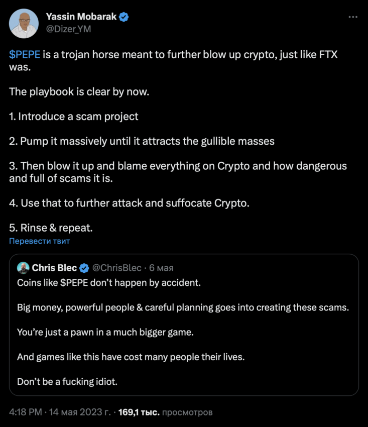 Основатель Dizer Capital Яссин Мобарак также не остался в стороне и назвал PEPE «троянским конем», цель которого заключается в подрыве доверия инвесторов к индустрии. Он считает, что рано или поздно мемкоин-пузырь лопнет, а власти объявят все криптовалюты опасными, прикрываясь защитой рядовых пользователей.