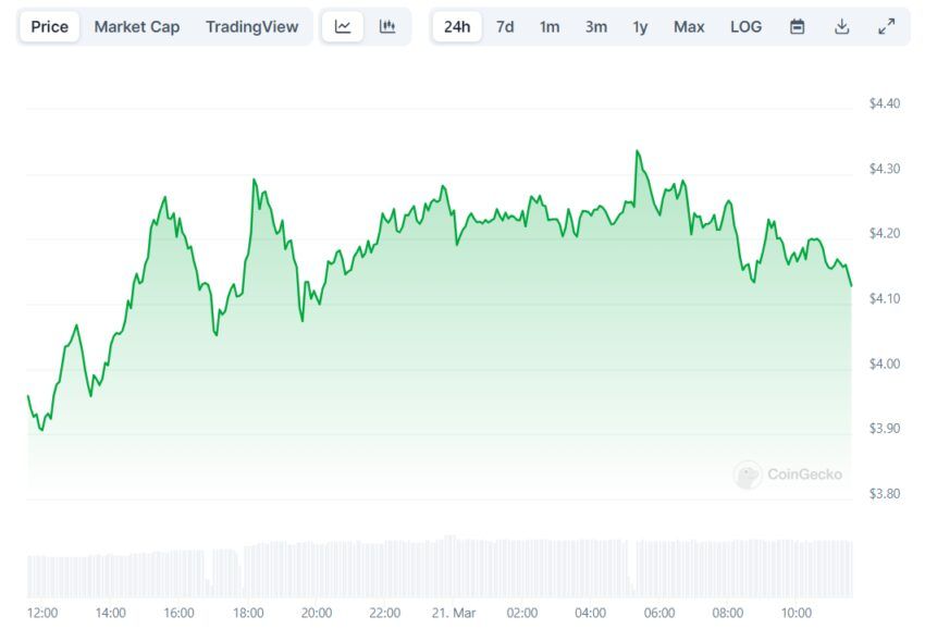 В моменте на фоне новости цена TON подскочила более чем на 10%. По данным CoinGecko, в настоящее время токен торгуется по $4,14, подорожав за последние сутки в общей сложности на 5%.