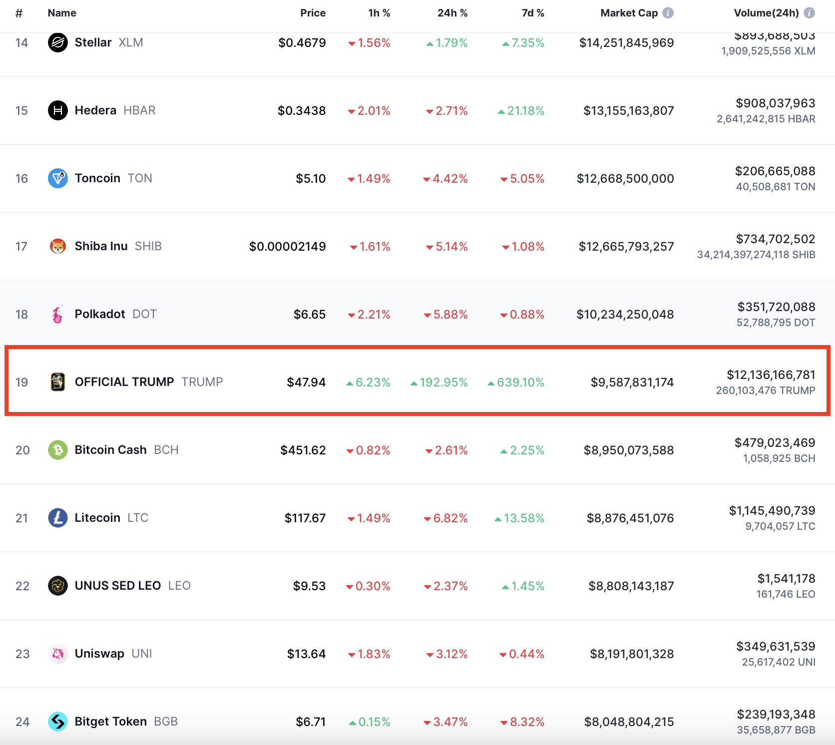 После запуска 18 января 2025 года мемкоин TRUMP продемонстрировал впечатляющий рост на 490% менее чем за 24 часа. Токен был анонсирован самим Трампом в его официальных аккаунтах на платформах Truth Social и X. Всего за три часа рыночная капитализация TRUMP достигла $8 млрд. В настоящее время капитализация составляет $9,588 млрд, благодаря чему мемкоин входит в топ-20 криптовалют по версии CoinMarketCap.