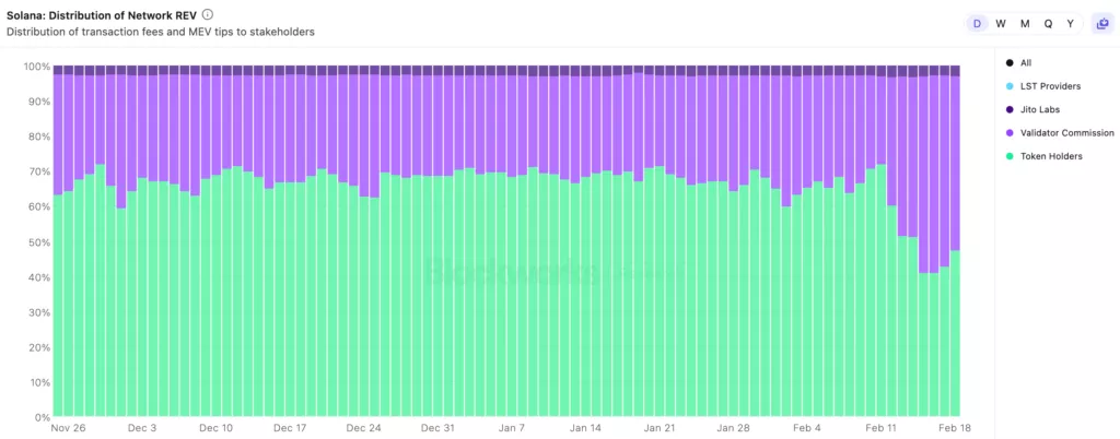 Внедрение SIMD-0096 также негативно повлияло на долю REV (комиссии и чаевые), распределенную между держателями токенов. В среднем за 30 дней до обновления она составляла 67%, после изменения модели — 46%. Для валидаторов соответствующий показатель вырос с 30% до 51%.