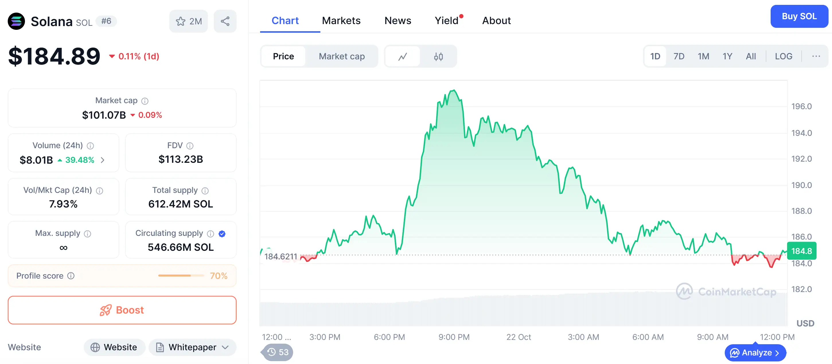 Цена Solana практически не изменилась. Источник: CoinMarketCap
