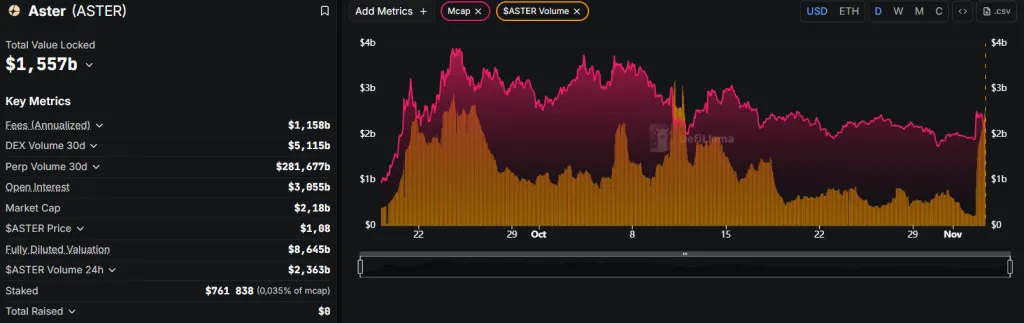 По данным DeFi Llama, суточный объем торгов Aster вырос с ~$220 млн до более чем $2 млрд. Рыночная капитализация увеличилась с $1,8 млрд до $2,18 млрд.