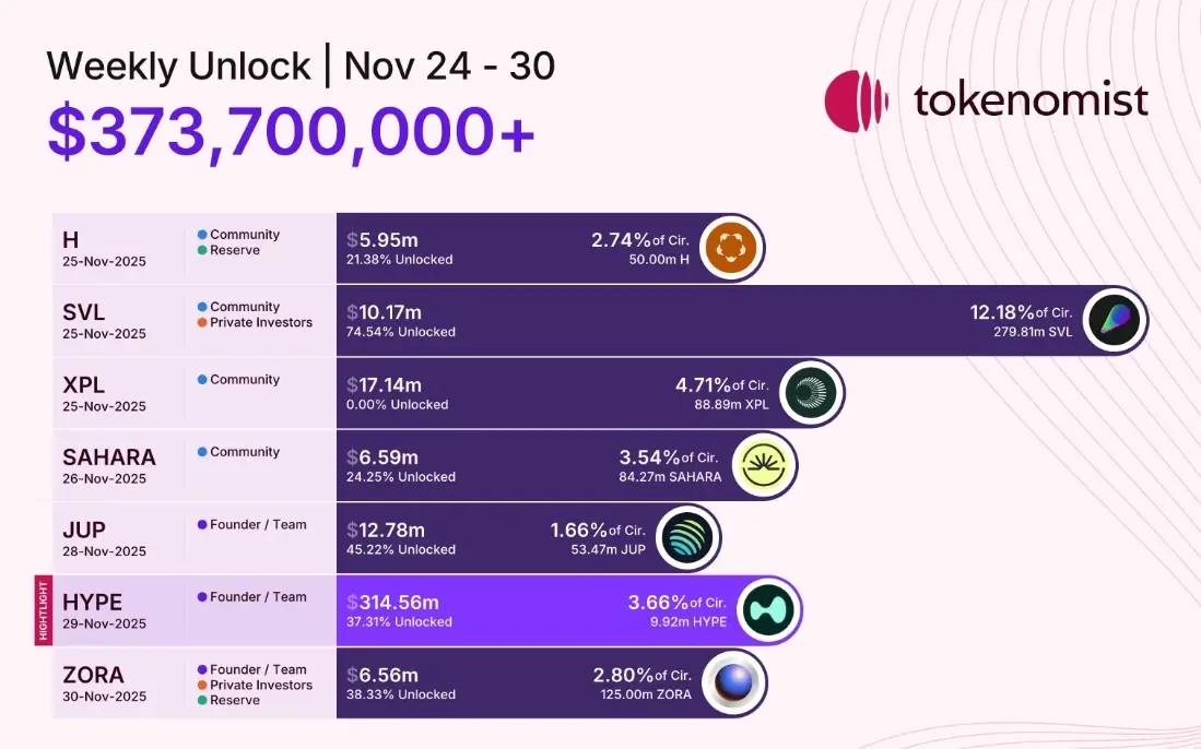 Hyperliquid возглавляет еженедельный список разблокировок с $314 млн, запланированными на субботу. Источник: Tokenomist