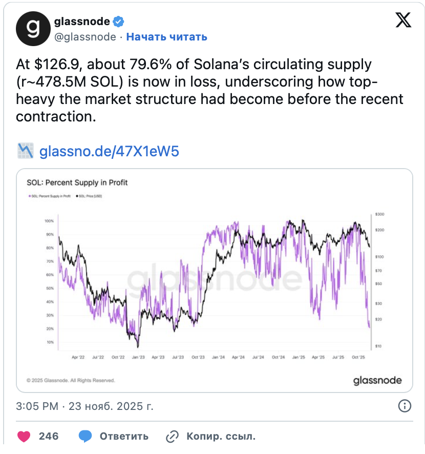 Потери конкретной компании отражают общую тенденцию в секторе. Данные аналитической платформы Glassnode показывают, что около 79,6% оборотного предложения SOL удерживается с убытком при цене 126,9$. Это около 478,5 млн токенов.