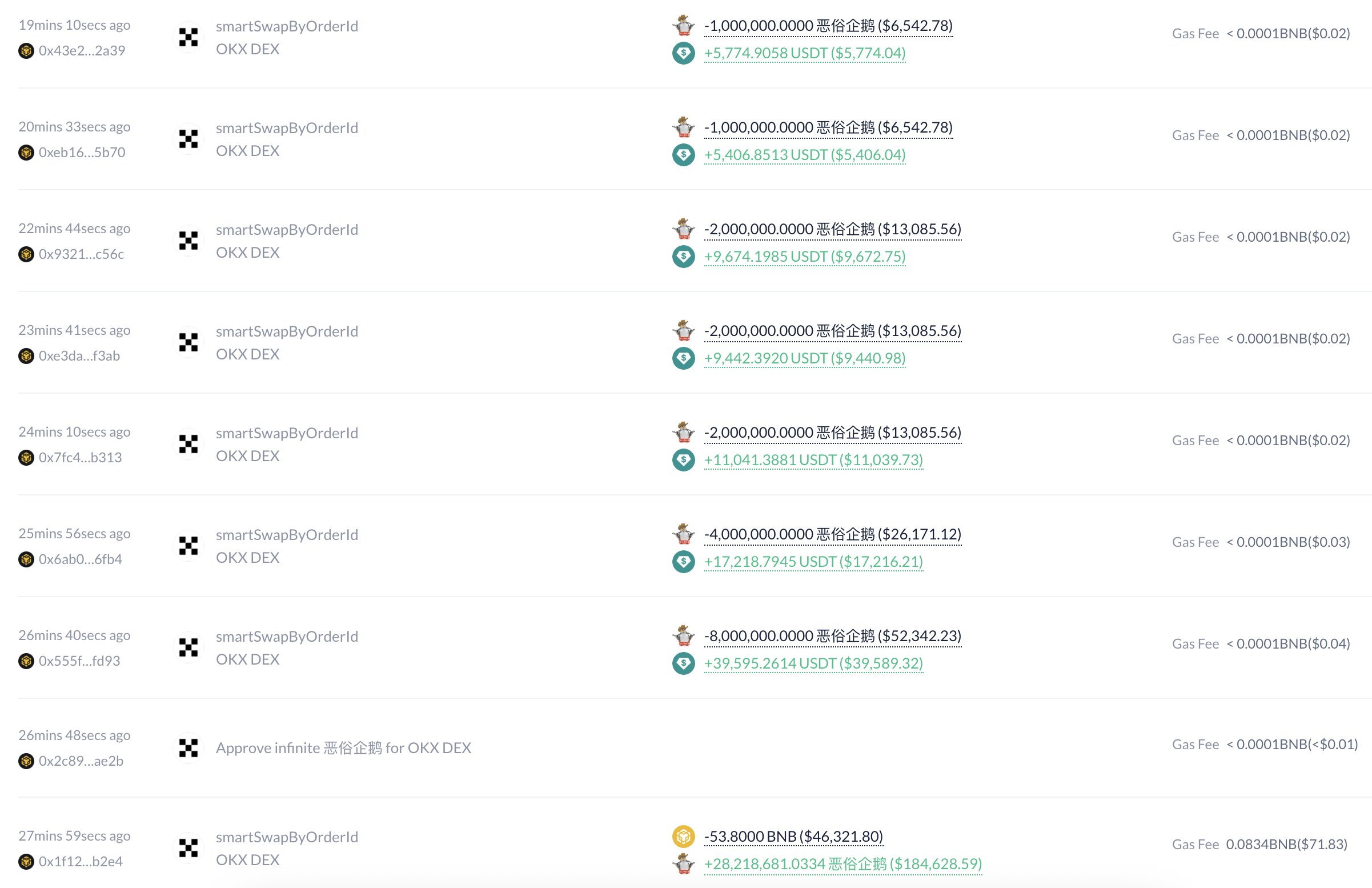 Трейдер купил 28,2 млн 恶俗企鹅 в момент листинга, потратив 53,8 BNB на сумму около $46 300. Спустя несколько минут он продал 27,2 млн монет примерно за $148 000 в USDT. На его кошельке осталось около 1 млн токенов стоимостью примерно $7 500.