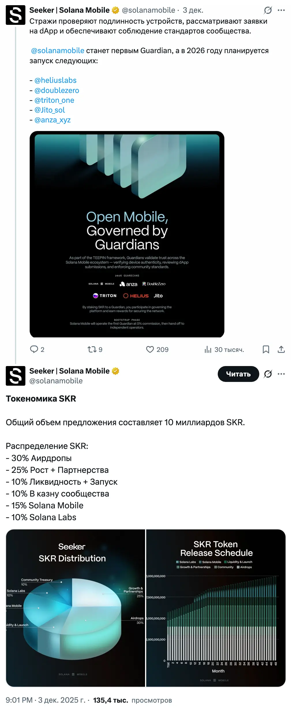 Для пользователей владение токенами SKR даст возможность получать вознаграждения за размещение активов у хранителей. Первым хранителем выступит Solana Mobile, а в 2026 году к ней присоединятся другие участники — Helius Labs, Double Zero и Triton One.