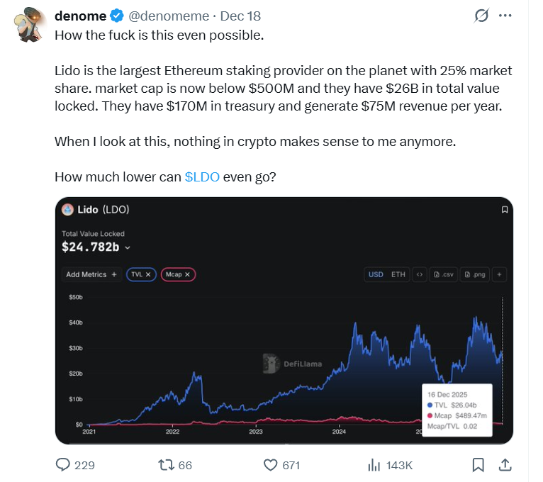 В сообществе Lido нарастает раздражение. Владельцы LDO не понимают, почему при сильных показателях протокола токен по-прежнему остается под давлением. Lido контролирует крупную долю стейкинга Ethereum, объем заблокированных средств сейчас около $25,6 млрд. Рыночная капитализация — примерно $467,5 млн.