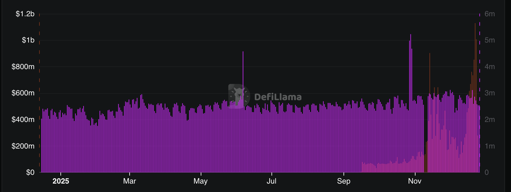 Постоянный объём и активные адреса в TRON. Источник: DeFiLlama