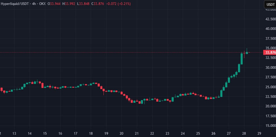 Цена токена Hyperliquid ($HYPE) за последние три дня выросла более чем на 50%. За неделю актив подорожал на около 60%. На момент публикации $HYPE торгуется выше $34: