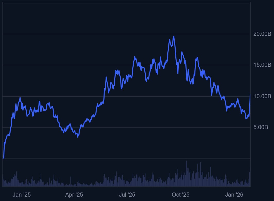 Рыночная капитализация актива впервые с декабря 2025 года превысила $10 млрд, по данным CoinMarketCap: