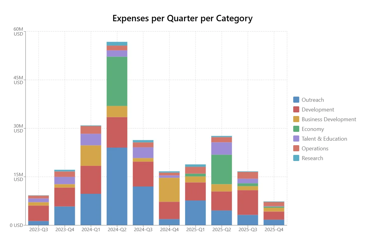 В четвертом квартале 2025 года большая часть расходов ($2,5 млн) пришлась на разработку. Еще $1,7 млн направили на аутрич, включая $870 000 на прямую рекламу.