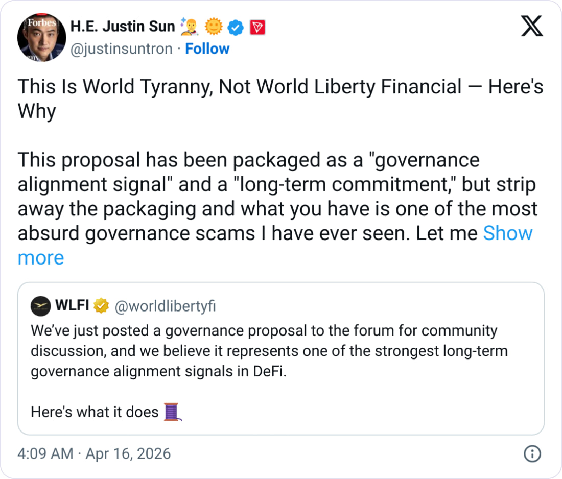 Его позиция особенно важна, потому что он не внешний наблюдатель. Сан — один из крупнейших инвесторов проекта и его советник. По его словам, около 4% $WLFI, которыми он владеет, сейчас заморожены, и именно поэтому он не может полноценно участвовать в голосовании.