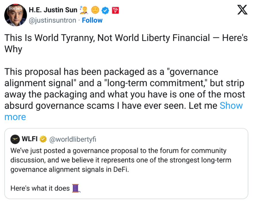 Неудивительно, что держатели $WLFI раскритиковали план компании. Крупнейший инвестор Джастин Сан с долей в 4% назвал эту стратегию «одной из самых абсурдных афер в сфере управления, которые я когда-либо видел». В том числе и из-за механизма голосования. Сан заявил, что некоторые крупные держатели, в том числе он сам, не смогли принять участие в голосовании, поскольку их активы уже заморожены.