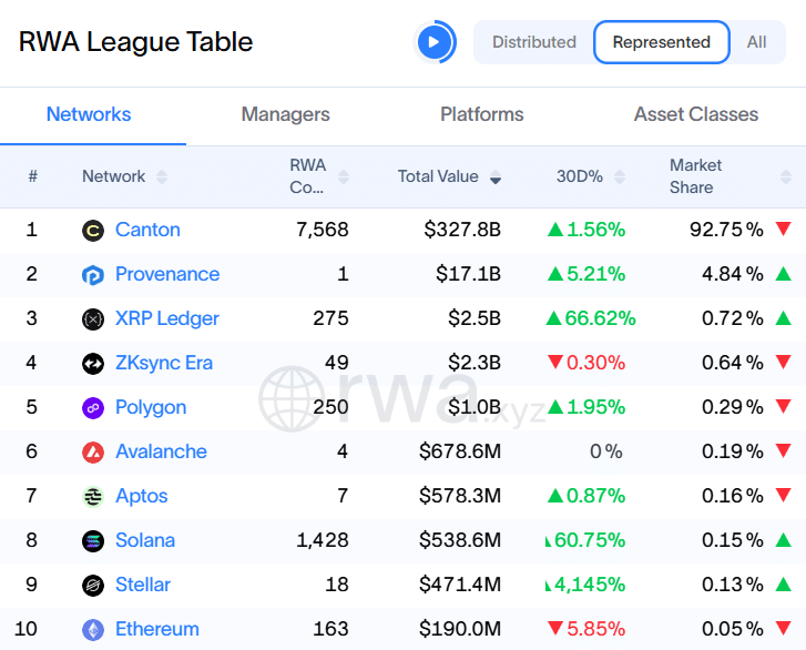 В глобальном масштабе $XRP Ledger в настоящее время занимает третье место среди блокчейн-сетей по объему реальным активам, уступая только Canton и Provenance. Он превосходит таких гигантов, как Polygon, Solana и Ethereum, показав рост на 66% за последний месяц, что является самым сильным показателем среди 10 ведущих сетей.