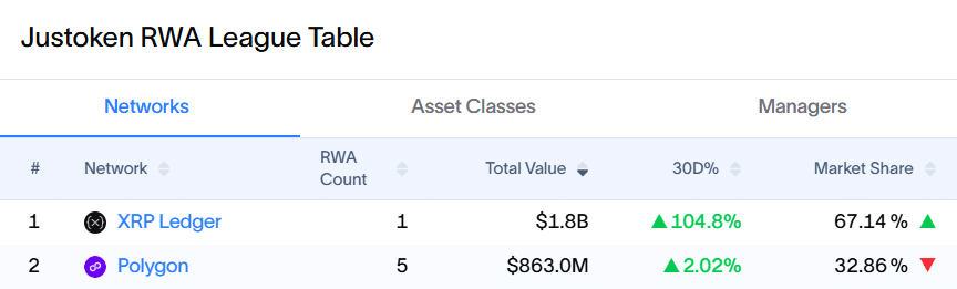 Первоначально Polygon владел примерно 49% от общей стоимости развернутых реальных активов Justoken, что составляло 863 миллиона долларов, в то время как $XRP Ledger занимал неболькое лидирующее положение с 51%. Однако после резкого роста стоимости JMWH доля $XRP Ledger увеличилась на 33% до 67%, в то время как доля Polygon снизилась на 33,6% до 32,86% на момент публикации .