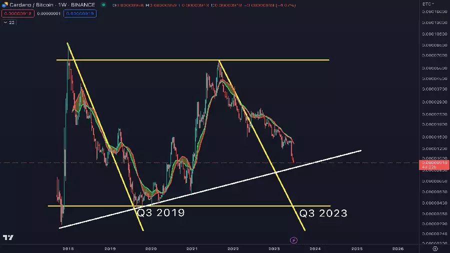 Бенджамин Коуэн (Benjamin Cowen) поделился предположением с подписчиками своего Твиттера. Аналитик построил аргументацию на данных технического анализа, представив график, иллюстрирующий прогнозируемое направление движения цены $ADA по отношению к биткоину.