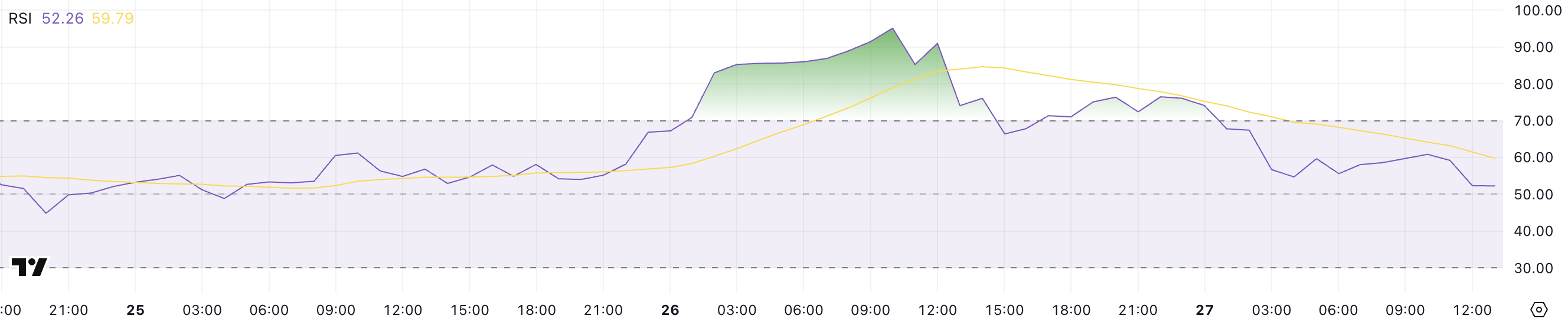 Тем временем индекс относительной силы (RSI) для криптовалюты скорректировался после достижения максимума на уровне 95. На момент написания этого материала показатель составляет 52,2.