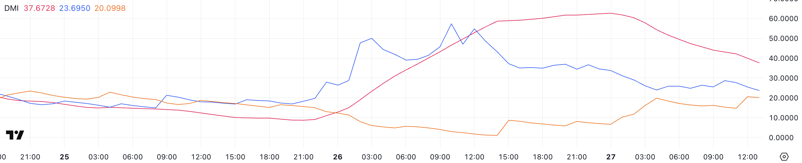 На графике DMI для токена Pi Network (прикреплен ниже) видно, что в настоящий момент ADX составляет 37,6. При этом в течение последних суток показатель колебался от 9 до 62,7. Значения выше порога в 25 указывают на сильный тренд.