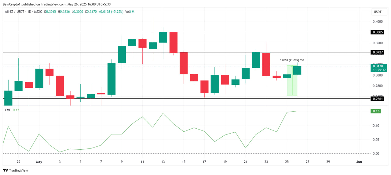 AI16Z показал резкий отскок с внутридневного минимума $0.260, зафиксировав +21% за последние 24 часа. Индикатор Chaikin Money Flow (CMF) показывает рост притока ликвидности, указывая на интерес со стороны крупных игроков.