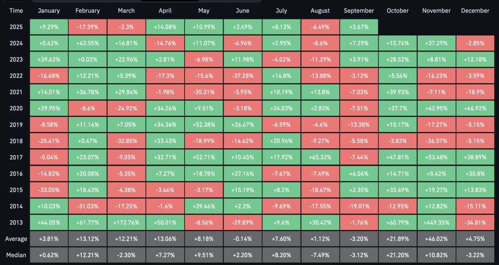 Трейдер Daan Crypto Trades напомнил, что третий квартал исторически самый слабый для биткоина — в среднем рост всего на 6%. «BTC демонстрирует очень низкую волатильность и закрывает квартал практически на нулях. Для третьего квартала это нормально», — написал он в соцсети X.