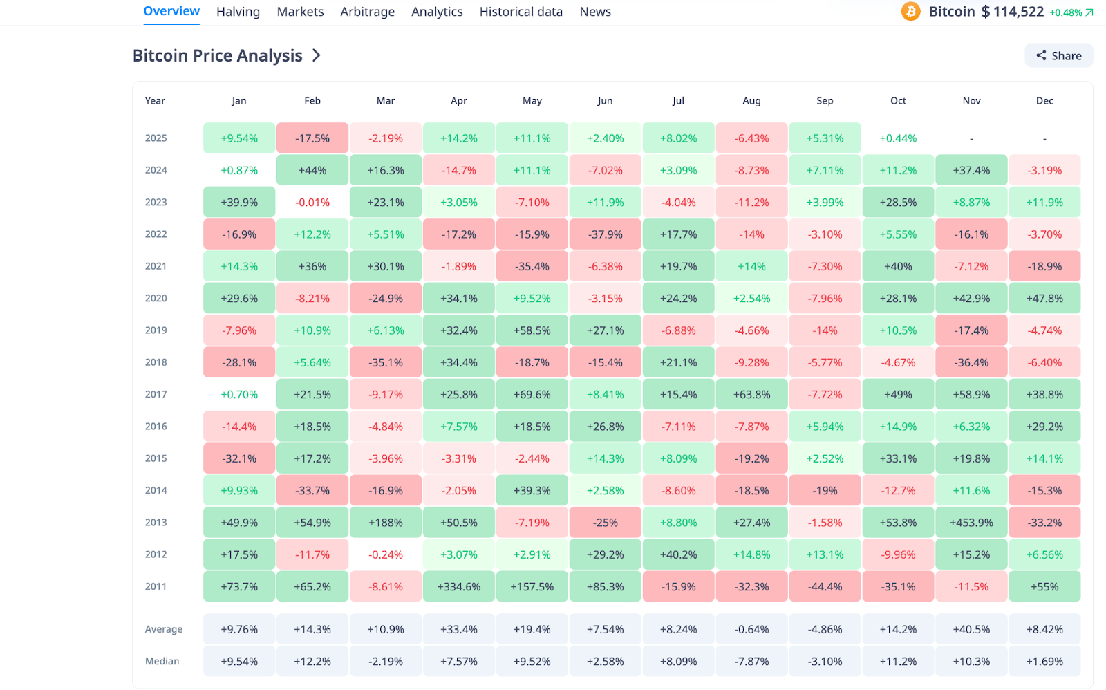 Сентябрь, напротив, неизменно был одним из самых слабых месяцев, со средним падением в 3%. Тем не менее, в сентябре 2025 года биткоин продемонстрировал рост на 6,6%.