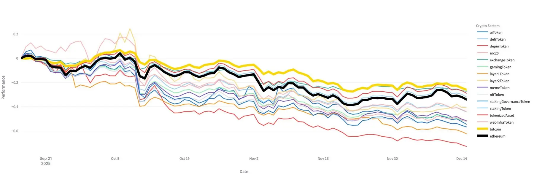 За три месяца биткоин подешевел на 26%, но превзошел по динамике большинство криптосекторов: цена эфира снизилась на 36%, токенов ИИ — на 48%, а мемкоинов — на 56%.