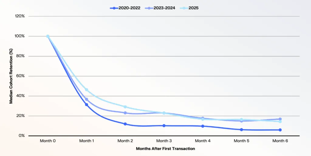 - Эра первопроходцев. Основу составляли криптоэнтузиасты, движимые новизной технологии. Их глубокая вовлеченность обеспечивала рекордно высокую вовлеченность (до шести месяцев), несмотря на скромные объемы.