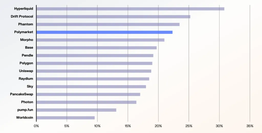 В Keyrock также выяснили, что Polymarket опережает большинство криптопроектов по удержанию аудитории. Его результаты выше, чем у 85% DeFi-проектов, кошельков и централизованных бирж.