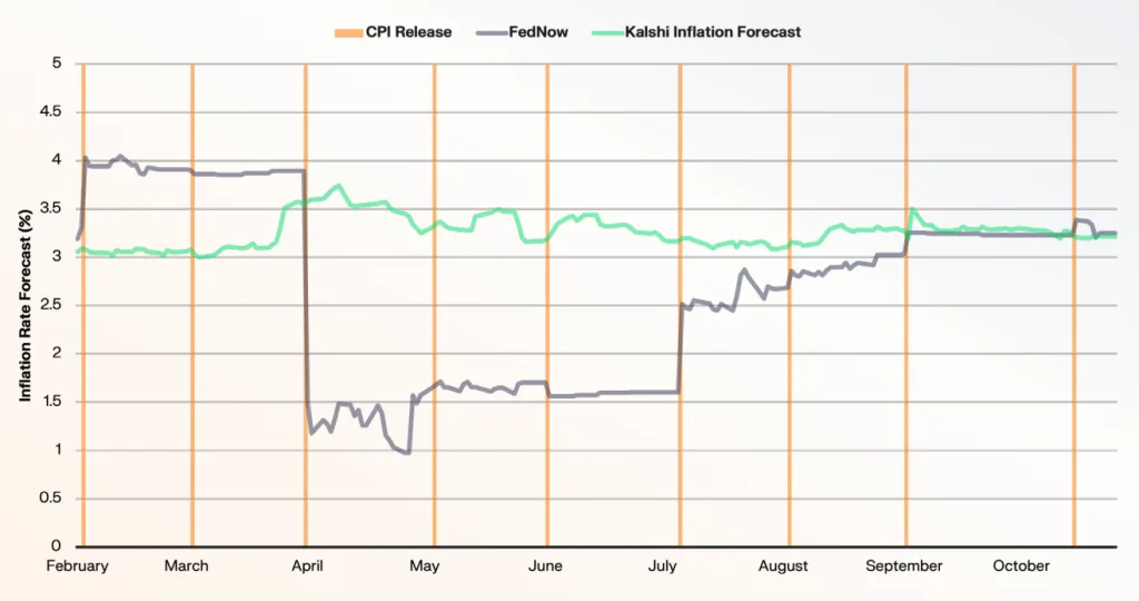 Например, в апреле перед выходом данных по CPI рынок Kalshi предсказал рост инфляции (прогноз поднялся с 3,05% до 3,58%). На FedNow показатель оставался на уровне ~3,9% только после официальной публикации.