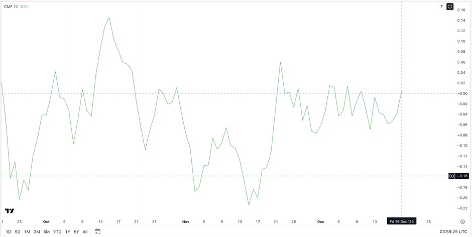 Однако денежный поток Chaikin остаётся отрицательным, что свидетельствует о том, что капитал всё ещё уходит из актива в течение внутридневного таймфрейма. Это расхождение показывает, что, несмотря на снижение давления на продажи, покупатели пока не вступают в это с убеждённостью.