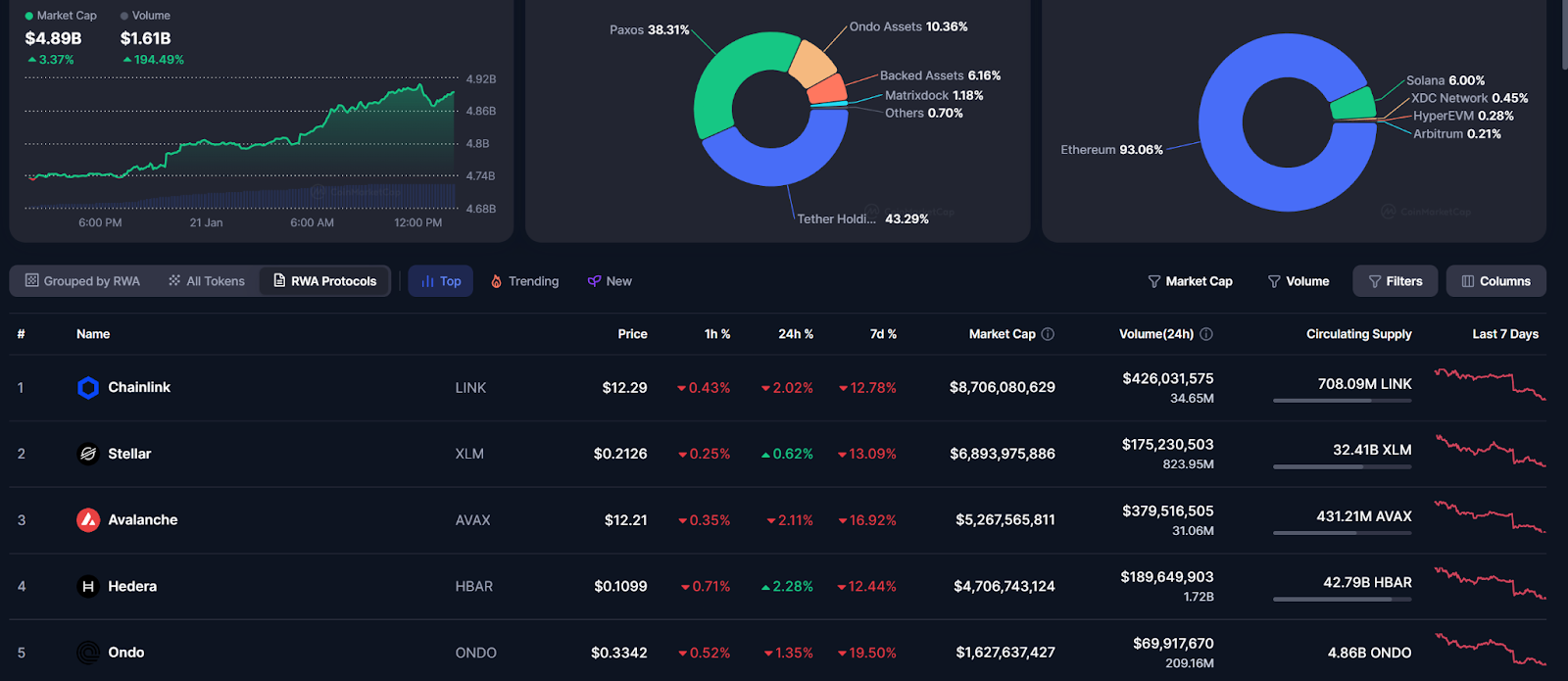 Еженедельные данные на 20 января показывают, что распределённая стоимость активов выросла на 4,1% по сравнению с неделей и достигла 216,6 миллиарда долларов, тогда как более широкий рынок RWA вырос на 23,8% до 350,1 миллиарда долларов.